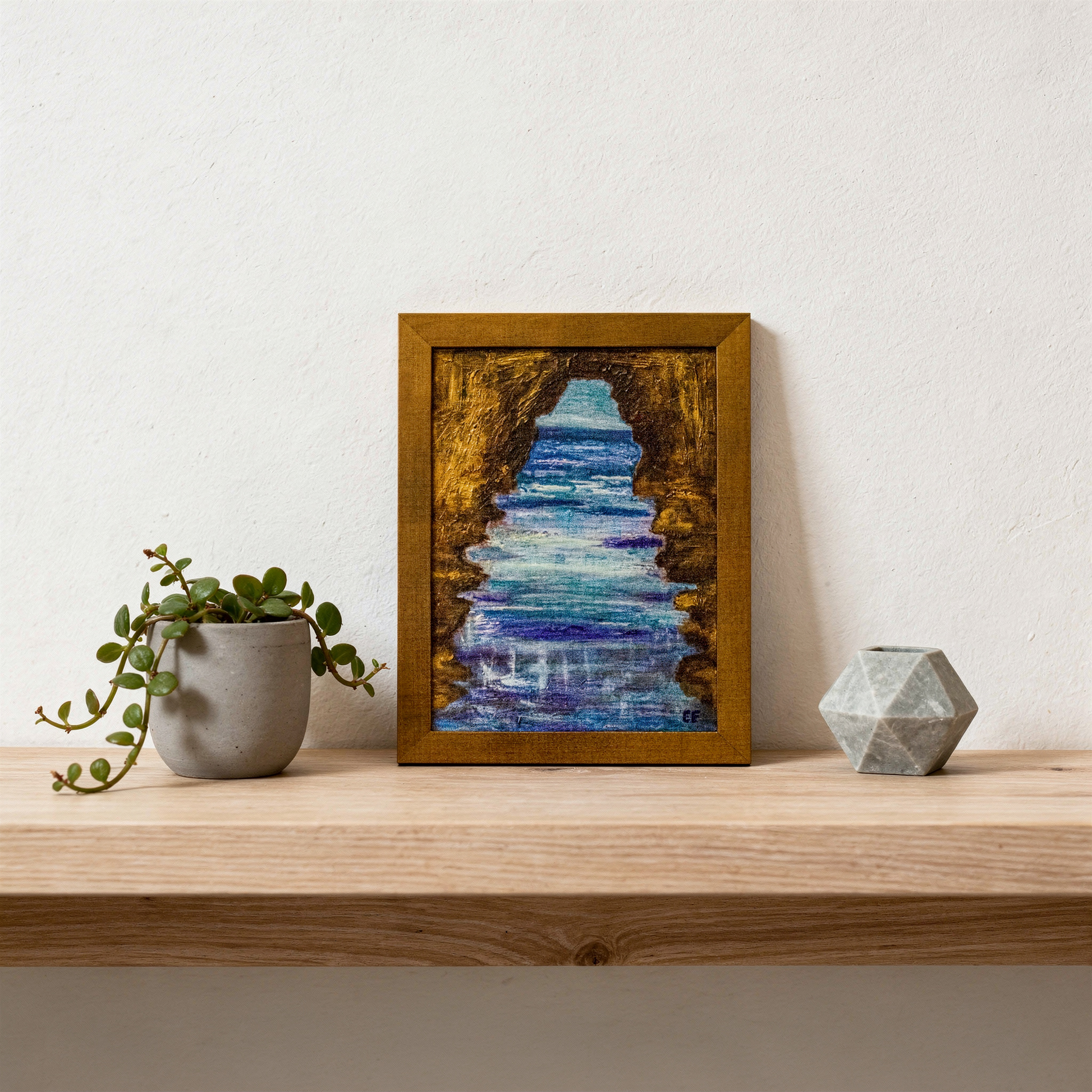 In quest’opera lo sguardo viene guidato attraverso una sorta di apertura naturale, quasi una fenditura nella materia della terra, che incornicia l’orizzonte marino. Le pareti rocciose, calde e intense nei toni bruni e dorati, sembrano custodire e allo stesso tempo rivelare il passaggio verso uno spazio più ampio e luminoso.
