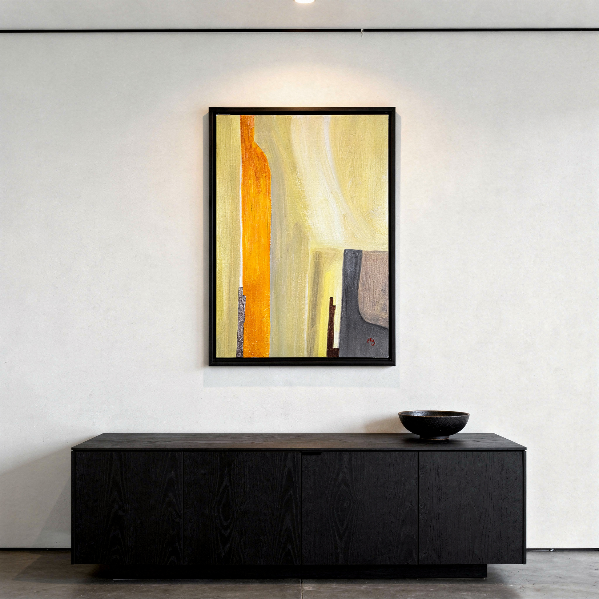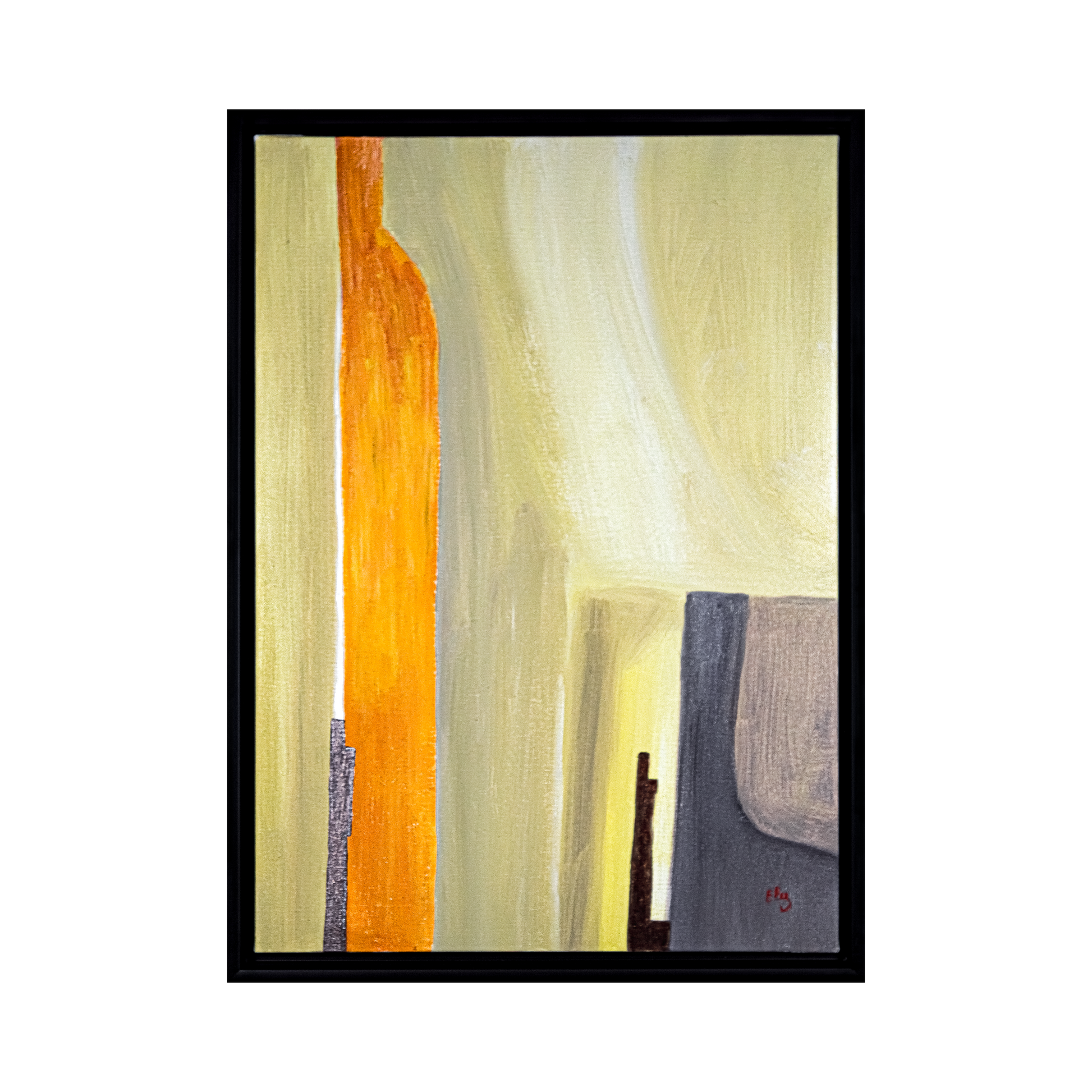 Una verticale calda, dorata e vibrante attraversa la composizione come un raggio di luce o una parete illuminata dal sole, creando un dialogo con i toni neutri e vellutati del fondo. Le campiture morbide e sfumate evocano un’atmosfera sospesa, quasi nebbiosa, dove spazio e luce si fondono in un equilibrio meditativo.